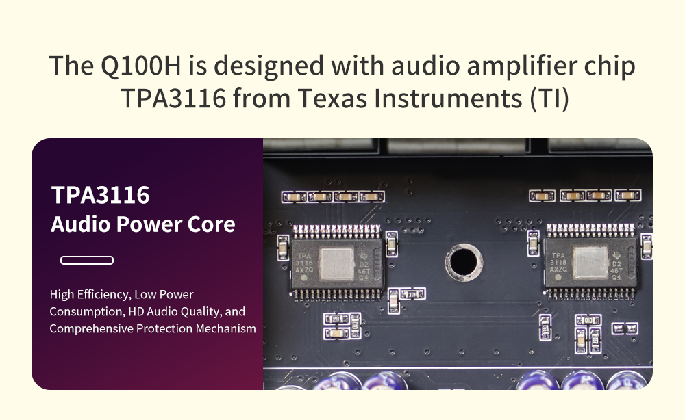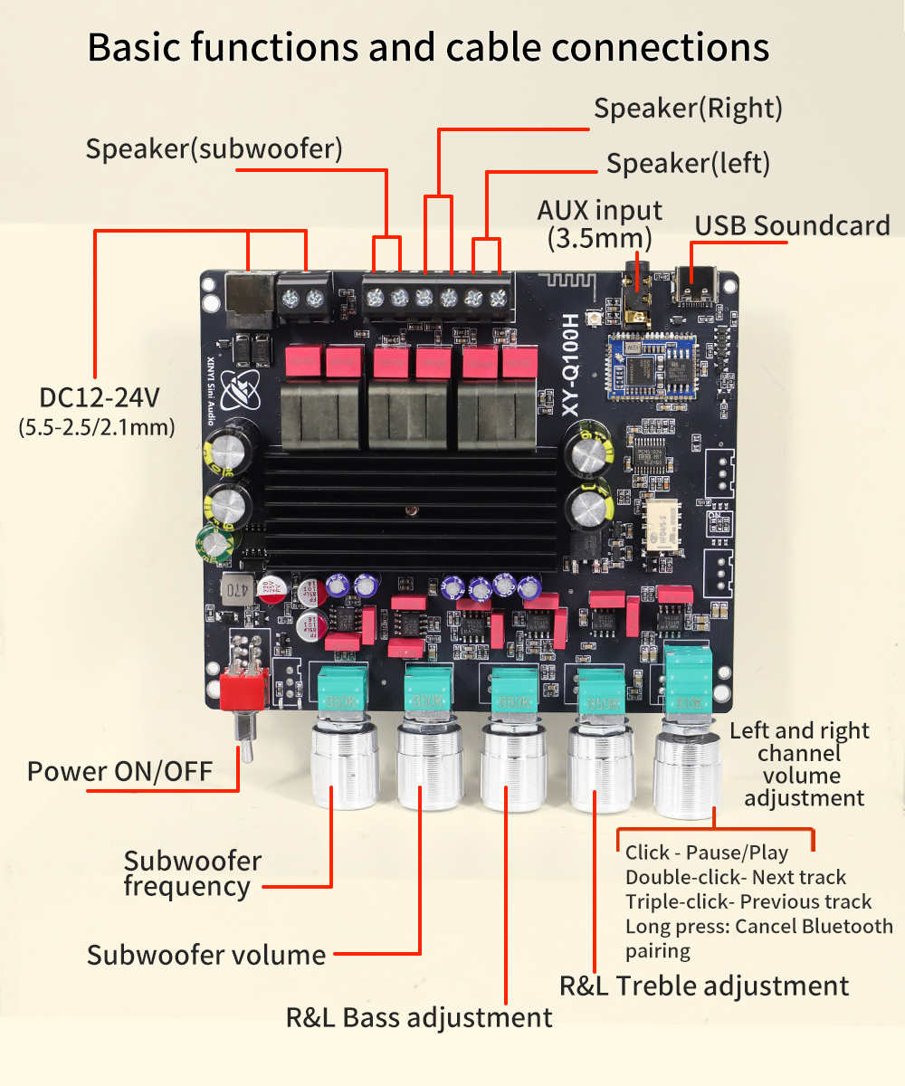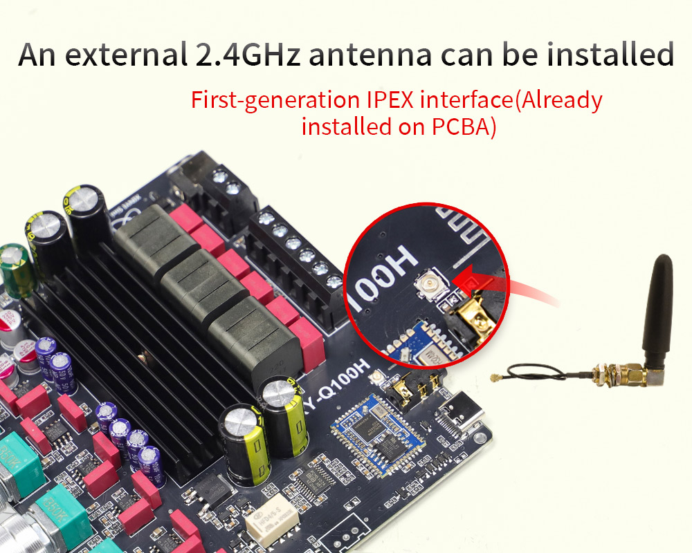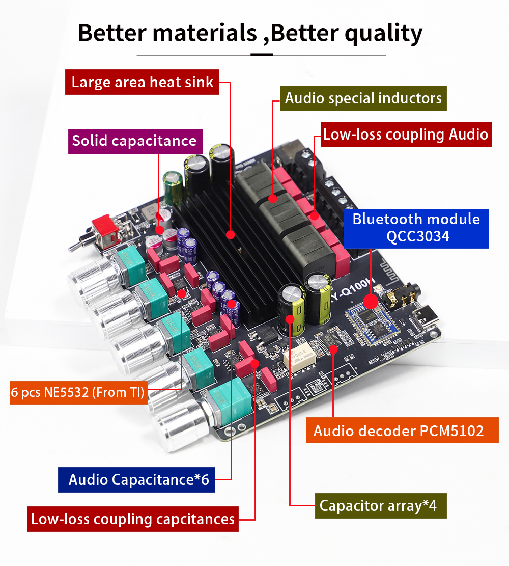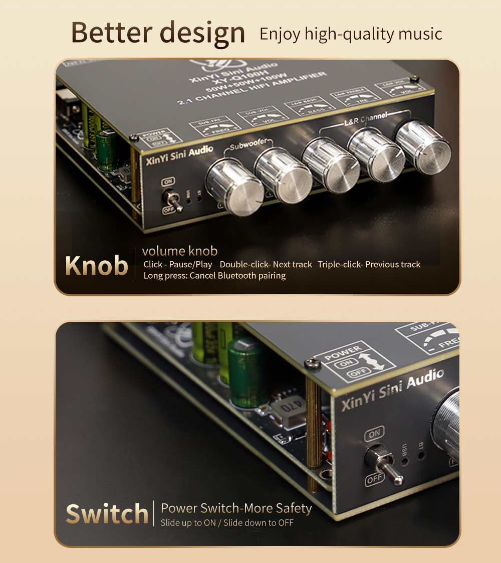 Equipped with TPA3116 amplifier chip delivering up to 50W*2 (R&L) + 100W subwoofer output. Suitable for both high-impact bass and balanced stereo sound.